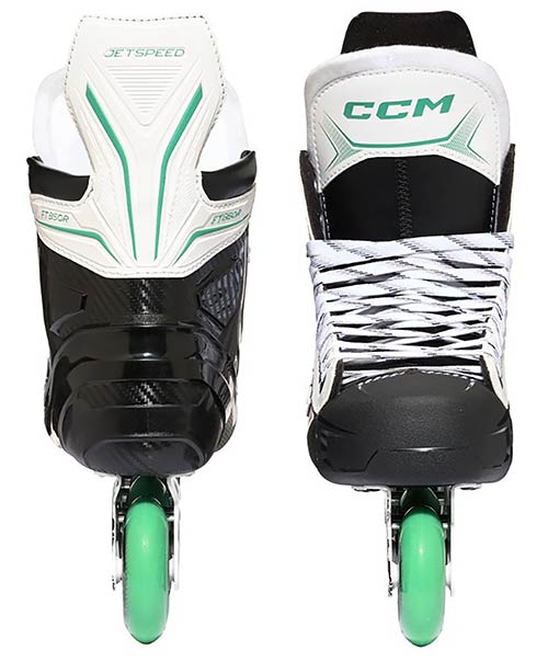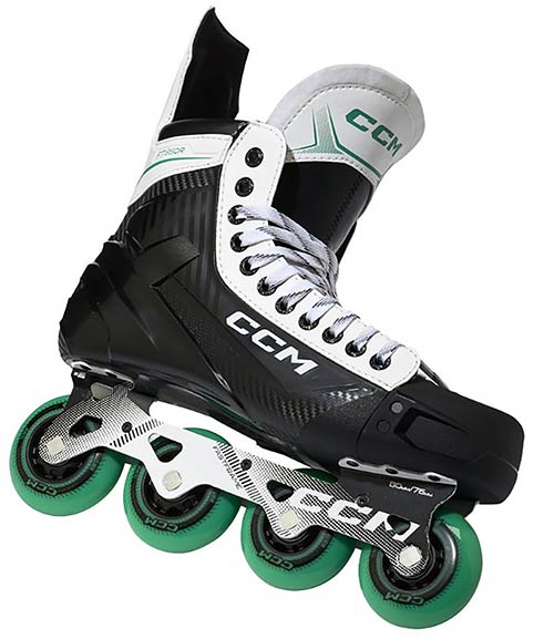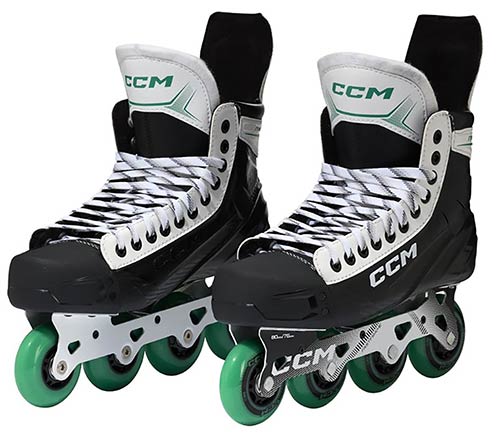 Pour les qualités de roulage, le patin s'appuie sur un châssis Hi-Lo en acier en deux parties, conçu pour l'équilibre et l'agilité. Les roues CCM Roller Wheels sont montées en configuration décalée : les roues plus petites favorisent les changements de direction rapides, les roues plus grandes augmentent la vitesse. Avec une dureté 82A, les roues sont conçues pour la durabilité et une adhérence équilibrée sur différents revetements. Des roulements ABEC 5 completent l'ensemble avec un roulage régulier pour l'entraînement et les matchs loisirs.