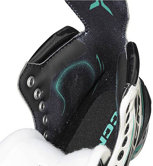 Pour la zone de la cheville, CCM utilise l'ADPT Memory Foam. Cette mousse multicouche avec différentes densités procure une sensation agréable a l'intérieur du patin et améliore l'ajustement autour de la cheville. Le résultat est un maintien sur qui combine confort et stabilité de maniere efficace.